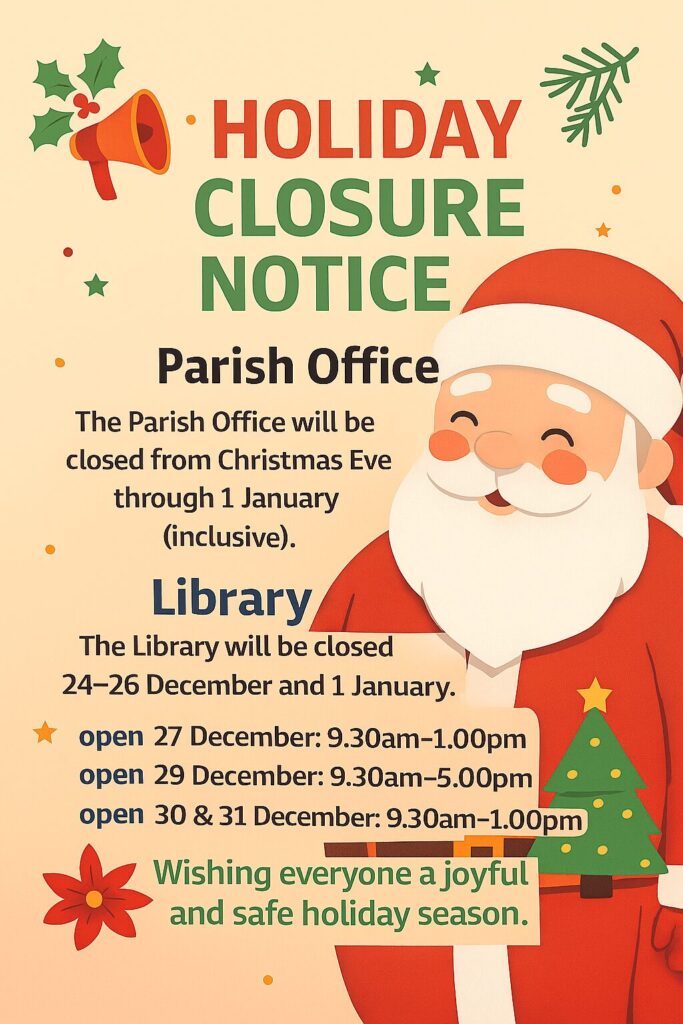 The Sandgate Parish Council Office will be closed for the holiday period from Christmas Eve (Wednesday 24th December) to Thursday 1st January 2026 inclusive.